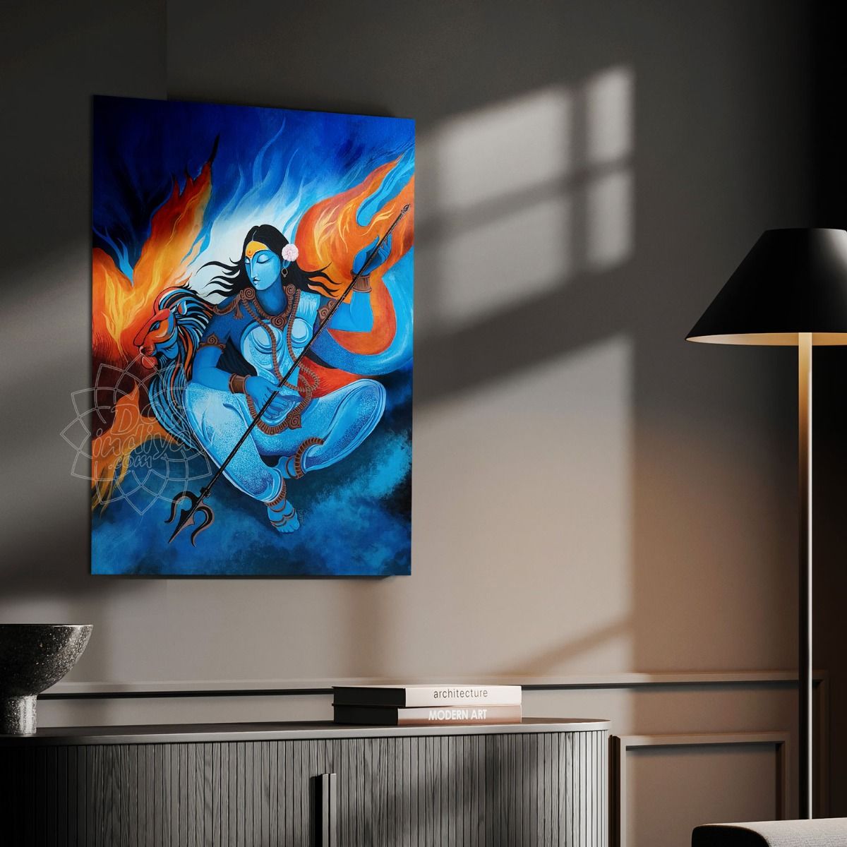 A striking handmade painting on canvas captures the divine presence of Maa Durga set against a deep, serene blue background.