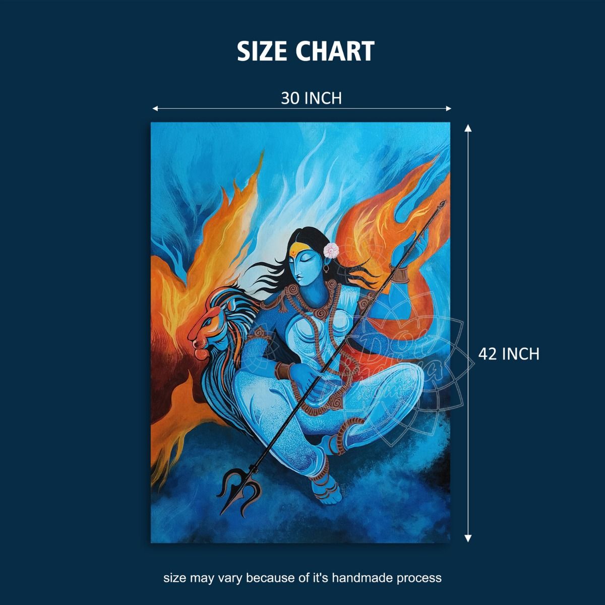 Original Certified Handmade Painting by Jayesh Shrimali of MAA DURGA. The goddess is portrayed with grace and strength, seated majestically beside her loyal lion, symbolizing courage and power. Her hands hold the Trishul prominently displayed, representing the destruction of evil and protection of righteousness. The rich acrylic colors enhance the vibrancy of her attire and the intensity of her expression, creating a powerful spiritual aura. The contrast of the blue backdrop with the warm tones of the lion and Maa Durga’s radiant form brings depth and balance to this devotional artwork.