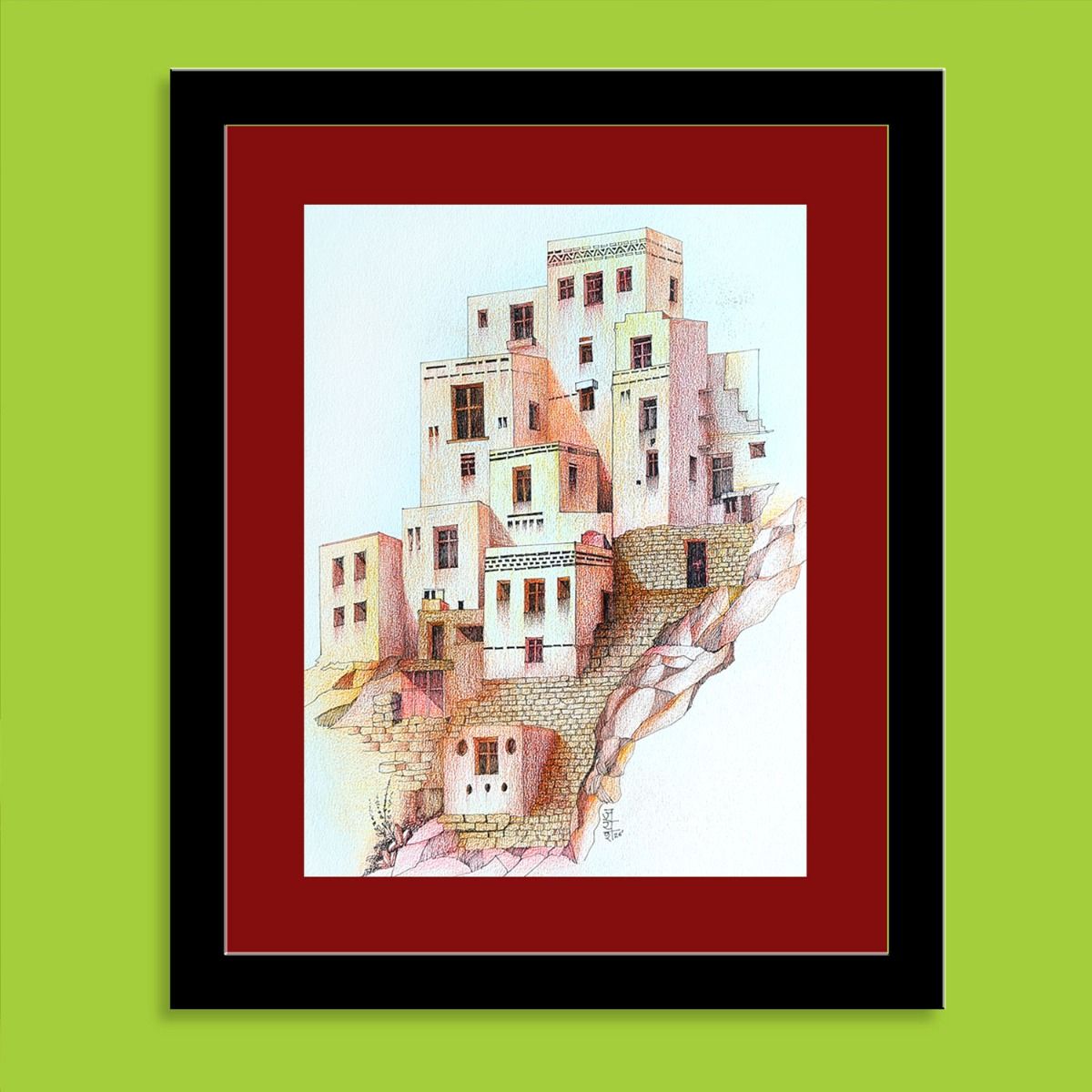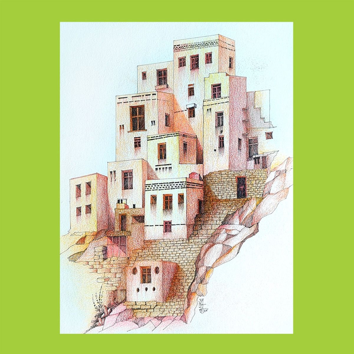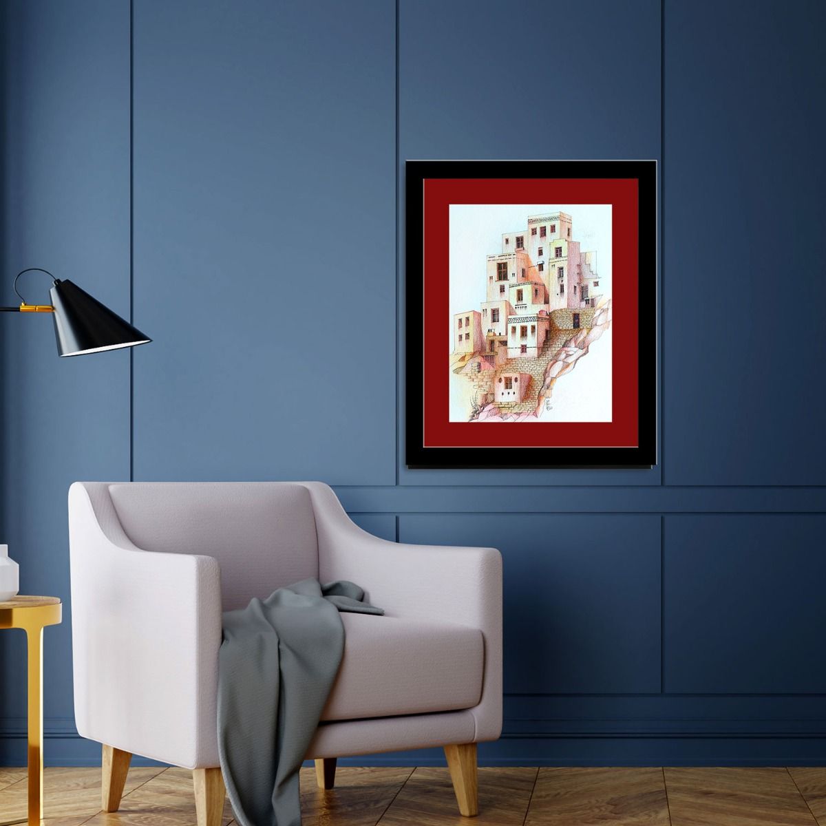 Original Certified A delicate Handmade Painting by Jayesh Shrimali using ink on paper, portrays a charming cluster of small mountain homes nestled along gentle slopes. Rendered in soothing light pink and soft yellow hues, the houses create a warm, dreamy atmosphere. Fine ink lines define rooftops and pathways, capturing serenity, simplicity, and peaceful hillside living.